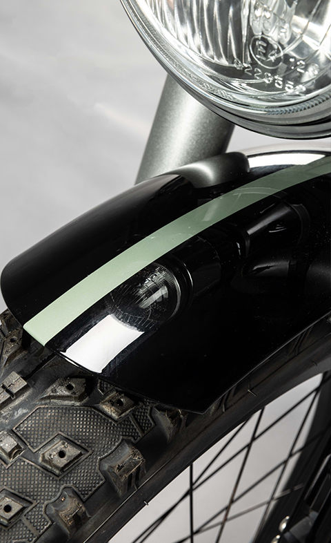 Une carrosserie grise et noir métallisé, ornée d’une bande centrale Vert Heritage sur les garde-boues et le capot. Une boîte à gant en fibre de carbone, des butées de direction en Alcantara noir avec surpiqûres Vert Heritage. Équipé d’une boîte automatique et d’une transmission par courroie, ce vélo intègre des technologies de pointe avec la plus grande exigence — pour sublimer la conduite, sans jamais sacrifier le confort ni le style.